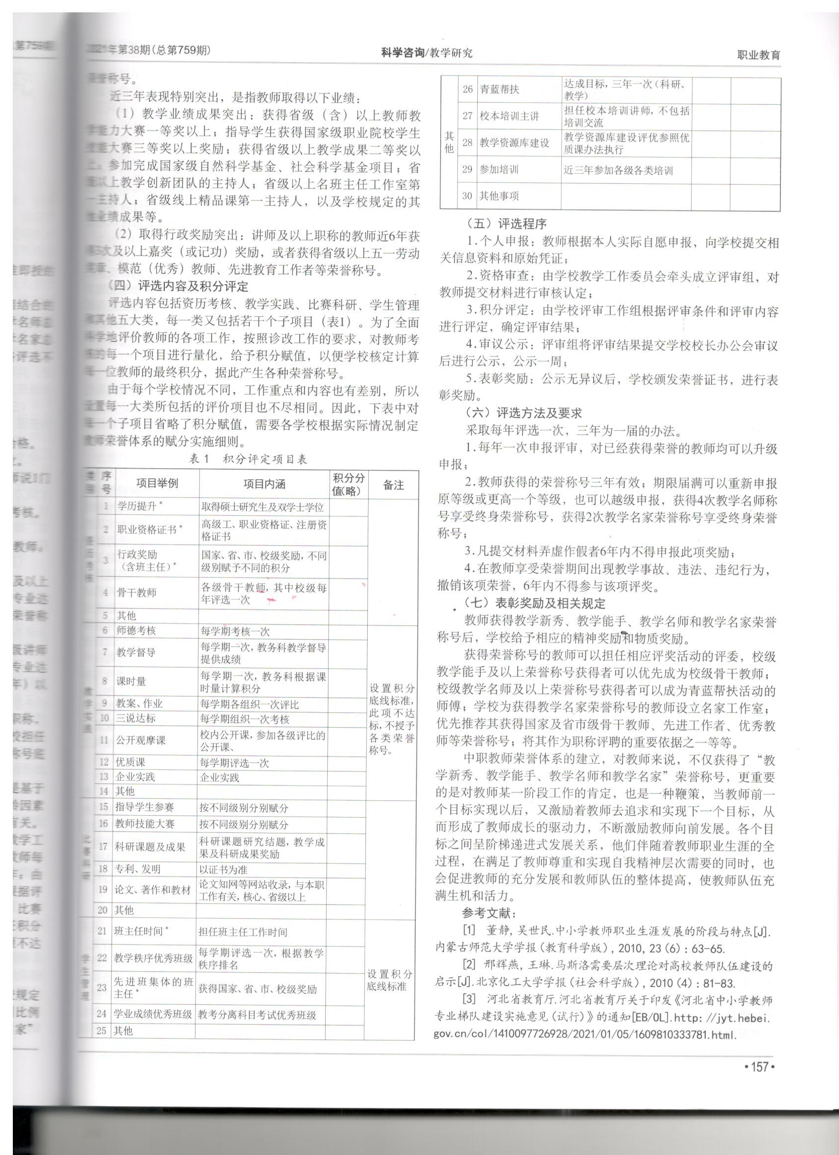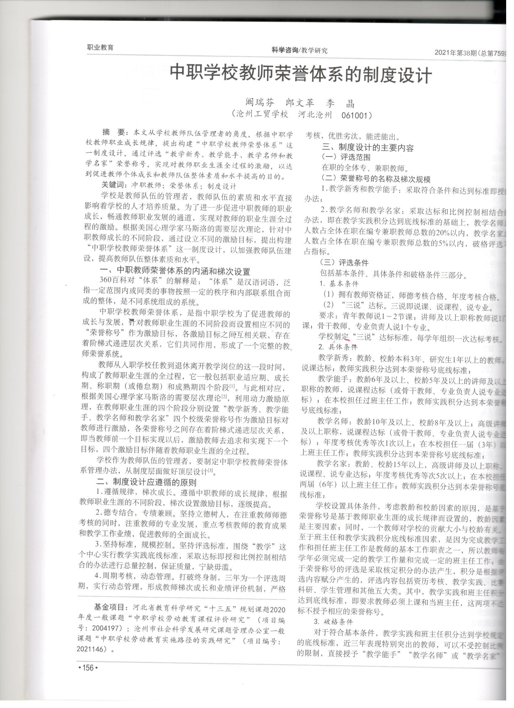 中职学校教师荣誉体系的制度设计